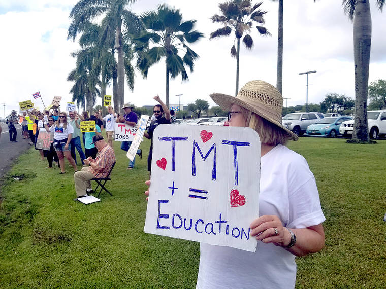 Yvonne Verburgt of Hilo is a retired chemist, a substitute teacher, and on Thursday, she was one of nearly 100 people lined up along Kanoelehua Avenue in support of the long-contested Thirty Meter Telescope.