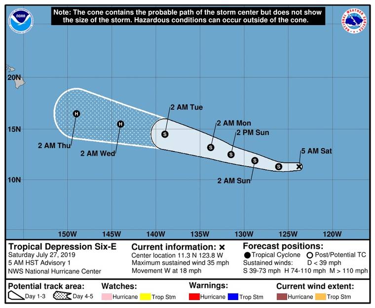 Tropical Depression Six-E, which was centered 2,160 miles east of Hilo at 5 a.m. today, is packing maximum sustained winds of 35 mph.