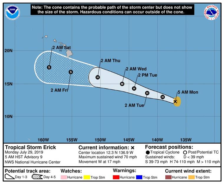 Erick was packing maximum sustained winds of 70 mph with locally higher gusts, just below Category 1 hurricane level, moving to the west at 17 mph. Tropical-storm-force winds extend outward up to 70 miles from the center.