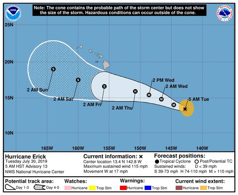 The now-major hurricane was about 1,485 miles east-southeast of Hilo at 5 a.m. today. Maximum sustained winds are 115 mph with higher gusts, and some additional strengthening is expected later today.