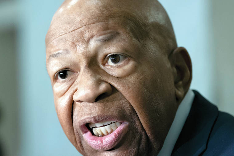 FILE - In this April 2, 2019 file photo, House Oversight and Reform Committee Chair Elijah Cummings, D-Md., speaks to reporters on Capitol Hill in Washington. President Donald Trump says there was nothing racist about his weekend tweets calling Congressman Elijah Cummings’ Baltimore-area, majority-black district a “rodent-infested mess” where “no human being would want to live.” Now Trump is trying to deflect the accusations of racism by labeling the prominent black congressman as racist himself and accusing Democrats of trying to “play the race card.” (AP Photo/J. Scott Applewhite)