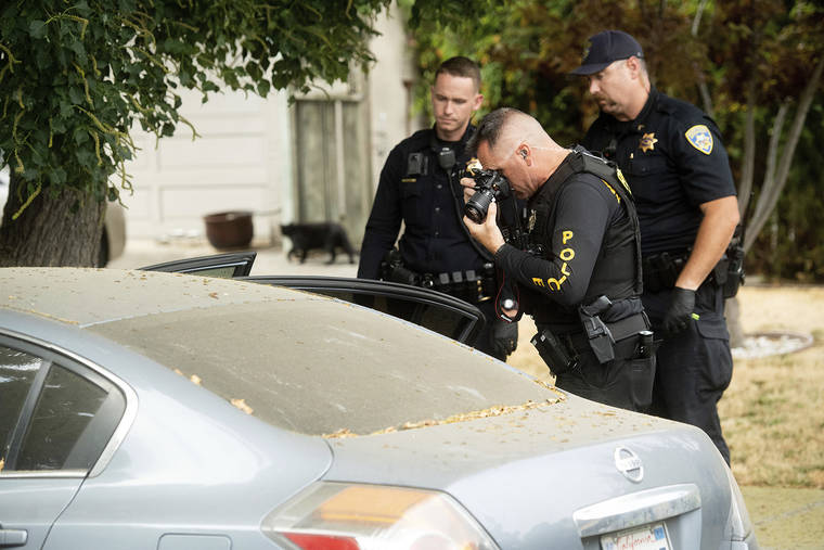 A police officer photographs a car outside the family home of Gilroy Garlic Festival gunman Santino William Legan on Monday, July, 29, 2019, in Gilroy, Calif. The Sunday evening shooting left at least three people, including a 6-year-old boy, dead and wounding about 15 others. (AP Photo/Noah Berger)