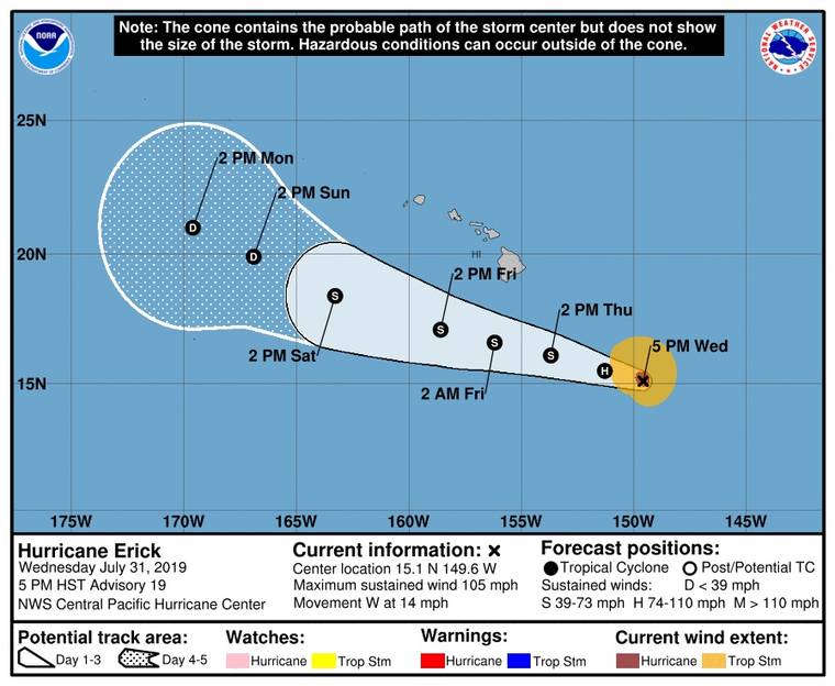 This map from the Central Pacific Hurricane center shows Hurricane Erick’s five-day forecast track as of 5 p.m. Wednesday.