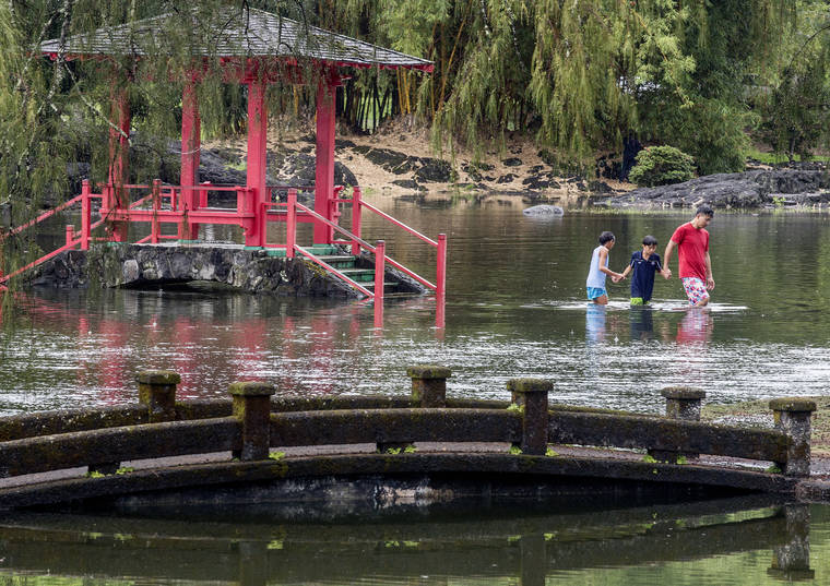 HOLLYN JOHNSON/Tribune-Herald Jon Ma and his children, Vivian, 11, and Victor, 8, play in the rain as they wade through water during 'king tide' while on vacation from California Thursday at Lili'uokalani Park and Gardens in Hilo. "They love this kind of weather. They love being free," said mother Theresa Ma of her children.