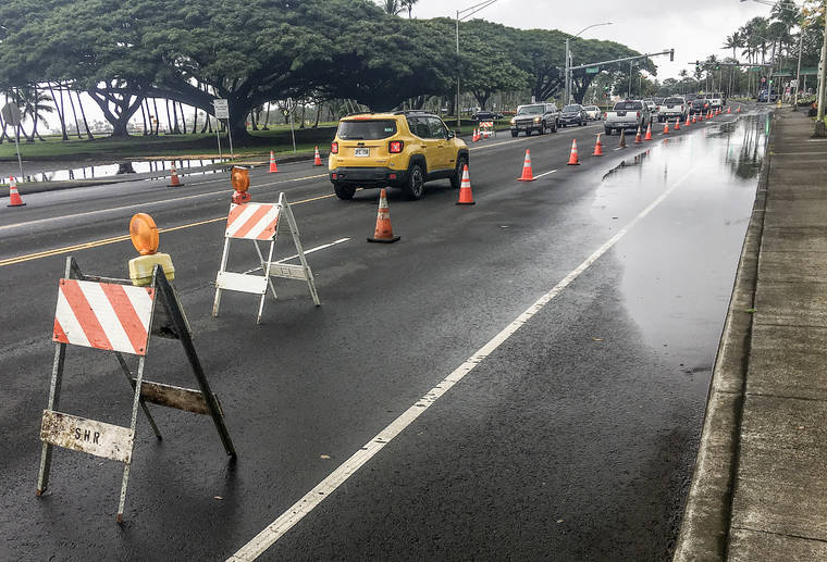 HOLLYN JOHNSON/Tribune-Herald Flash flooding from heavy rains caused by Tropical Storm Erick closes a lane of traffic on Kamehameha Avenue at the intersection of Pauahi Street on Friday in Hilo.