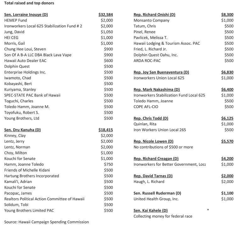 Rep. Richard Onishi of Hilo was the top fundraiser among the island’s House members, collecting $8,300, with $4,500 coming from eight donations of $500 or more. House members run every two years, compared to four years for the Senate.