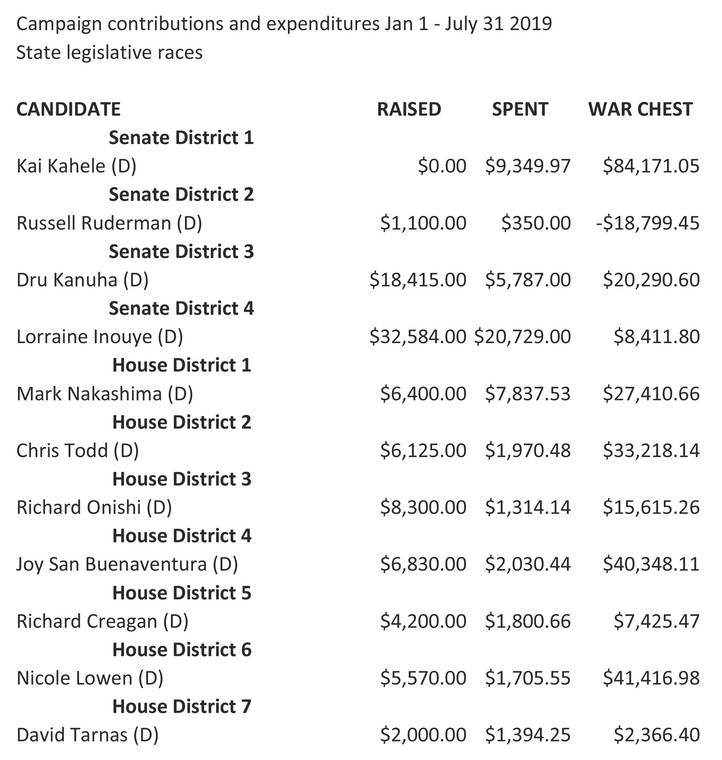State Sen. Kai Kahele, of Hilo, who is running for Congress, reported raising no state money, but collected $398,980 in his federal campaign during the same period. His contributions are reported to the Federal Election Commission.