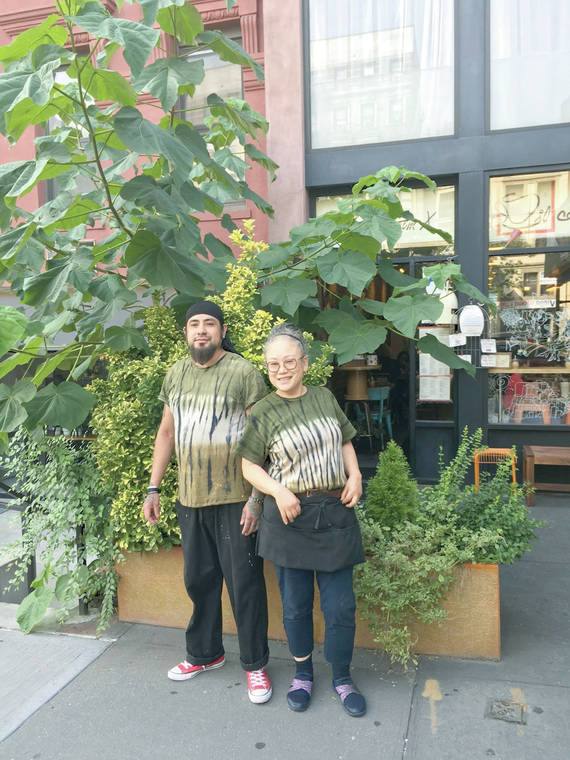 Courtesy of VOLTAIRE MOISE Owner of Caffe Latte Harlem, Younghee Han, and chef Jorge Apango proudly show off their tropical-looking mini garden featuring Paulownia tomentosa, or princess tree or empress tree, for a bold effect.