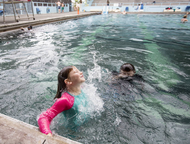 Ava Aiona, 7, swims with her brother, Patrick Aiona III, 10, on July 26 during public recreational and lap swim at Kawamoto Swim Stadium in Hilo.