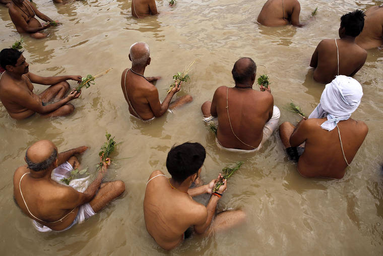 Members of the Hindu Brahmin community perform rituals Thursday in the River Ganges in Prayagraj, India. Brahmins, or Hindu upper castes, believe performing rituals on this day will wash away their sins.