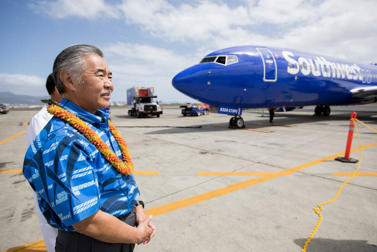 Hawaii Gov. David Ige greets the Southwest Airlines' inaugural flight to Hawaii in March at Daniel K. Inouye International Airport in Honolulu. (Photo: Southwest Airlines)