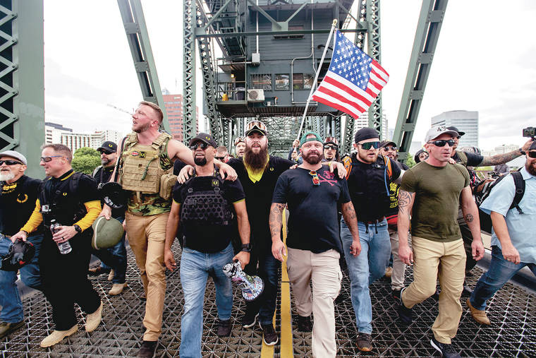 The events began late in the morning. Flag-waving members of the Proud Boys, Three Percenters militia group and others gathered downtown, some also wearing body armor and helmets. Police said they had seized the weapons, including shields, from multiple groups as they assembled along the Willamette River, which runs through the city. More than two dozen local, state and federal law enforcement agencies, including the FBI, were in the city for the right-wing rally that was expected to draw people from across the country. Portland Police said all of the city’s 1,000 officers would be on duty for the gathering that was hyped on social media and elsewhere for weeks.