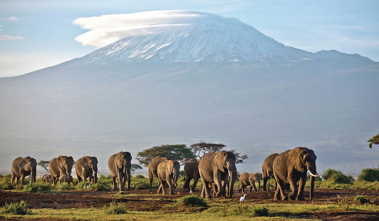In this 2012 file photo, adult and baby elephants walk in the dawn light as the highest mountain in Africa, Tanzania's Mount Kilimanjaro, is seen in the background, in Amboseli National Park, southern Kenya. (AP Photo/Ben Curtis, File)