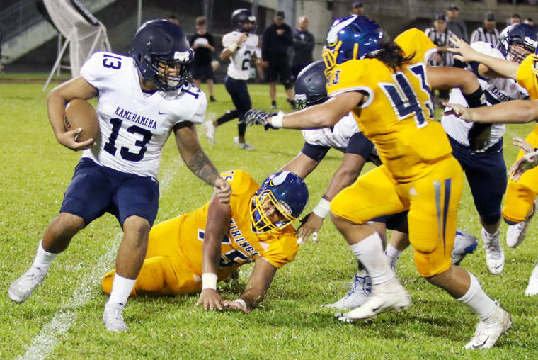 The Vikings’ defense forced five turnovers, including two interceptions by Kainalu Lewis, and held the Warriors (1-2) to 10 yards rushing. Of Kamehameha’s 110 yards of offense, nearly half came on Austin Wilson’s touchdown reception in the fourth quarter.