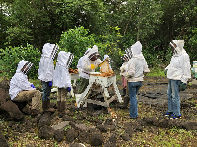 Courtesy photo A group inspects a hive at the Big Island Beekeepers Association's apiary located at the Komohana Research and Extension Center.