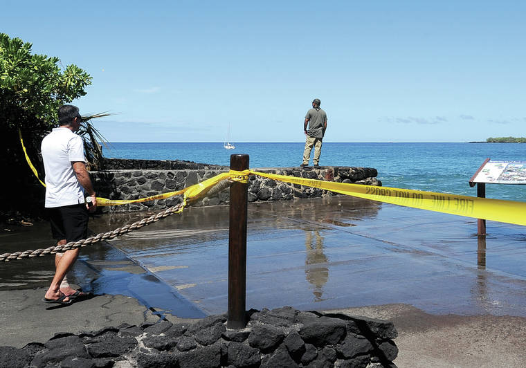 Hawaii Fire Department Ocean Safety Division Capt. Chris Stelfox, left, and Aaron Mahaulu of the DLNR survey the water at Kealakekua Bay after a Tuesday morning shark attack. (Laura Ruminski/West Hawaii Today)