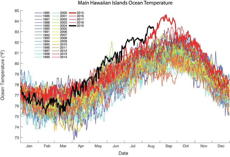 Ocean temperatures are extremely warm right now across Hawaii. They’re about 3 degrees warmer than typically experienced in mid-August. (Courtesy NOAA/Special to West Hawaii Today)
