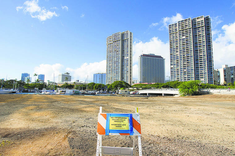 In 2016, the state DLNR Division of Boating and Ocean Recreation(DOBOR) held a meeting at the Hawaii Yacht Club to update community members about Ala Wai Small Boat Harbor projects. Pictured is the site of the failed multi-purporse Honey Bee USA development project at the Ala Wai Small Boat Harbor. (Photo by Cindy Ellen Russell/crussell@staradvertiser.com)