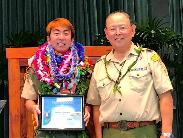 Brad Nakamura, 18, of Scouts BSA (formerly Boy Scouts of America) Troop 23 was presented the organization’s highest rank of Eagle Scout during a Court of Honor on Aug. 11 at Honpa Hongwanji Hilo Betsuin’s Sangha Hall in Hilo, the sponsor of Troop 23.