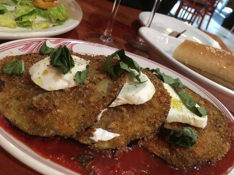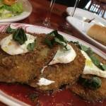 orders, as well as the table service and wondered why, on a Friday night, she did not get more help. But the food came out on a timely basis. We ordered an assortment of appetizers — eggplant parmesan, fried calamari, clams in garlic sauce and a caprese salad. We ordered too much food, as the portions were larger than we expected. The MacMurray Ranch Pinot Noir from Sonoma was smooth and fruity, however with a short finish, but went well with the food we ordered.