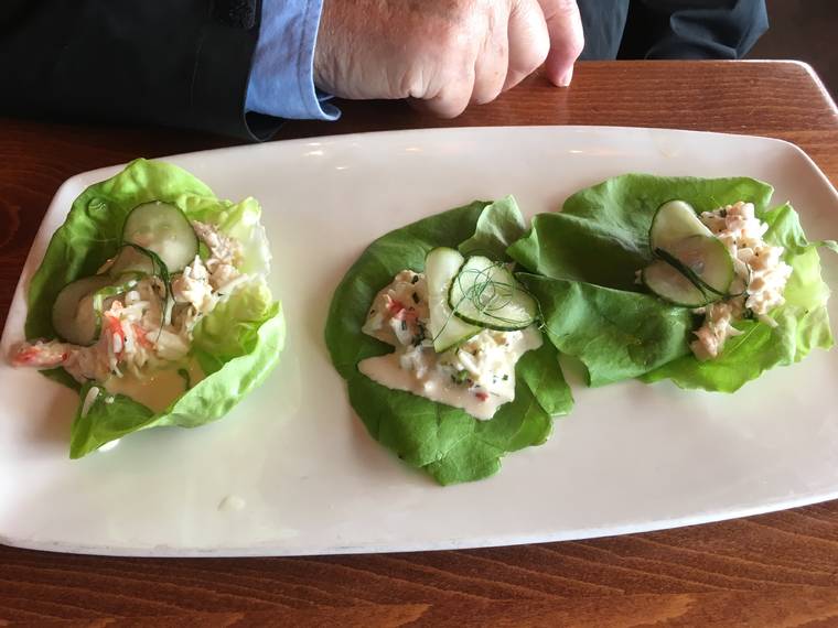 Jim had the king crab salad — three butter lettuce cups with red king crab, citrus, fennel and pickled cucumber.