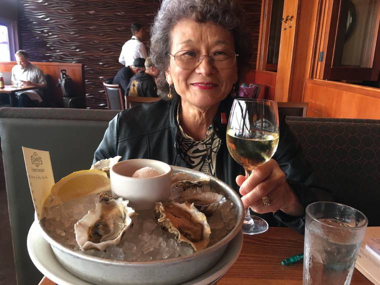 For starters, besides the wonderful, fresh oysters, Elliot’s has shrimp, calamari, Dungeness crab leg cocktail, smoked salmon fritters, crab cakes or steamed mussels. White clam chowder or spicy crab and corn chowder were the choices for soup. Shellfish salad of greens, poached prawns and scallops was a salad choice, and pan-fried Pacific oysters, Dutch Harbor red king crab legs, Bering Sea bairdi crab, crispy Pacific rockfish, Alaskan True cod and chips or Copper River sockeye salmon were the entree choices.
