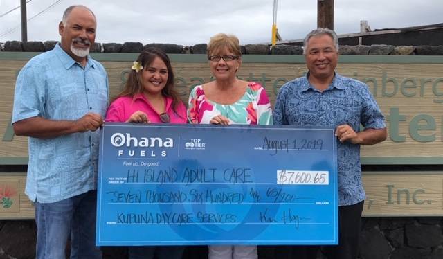Pictured, from left, are Kimo Haynes, president of Hawaii Petroleum; Joy Madriaga, senior account manager with Hawaii Petroleum; Marcie Saquing, executive director of Hawaii Island Adult Care; and Jay Ignacio, board president at HIAC. Hawaii Island Adult Care was the most recent beneficiary of the Ohana Fuels “Fuel up. Do good.” program. Ohana Fuels partners with nonprofit organizations that serve the needs of the community and donates a portion of the proceeds from every gallon of gasoline purchased at its locations in that community. The total donation to HIAC was $7,600.65 from gasoline sales during the second quarter of the year at Hawaii Island Ohana Fuels locations plus proceeds from car washes hosted during the same time period.