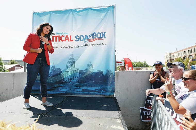 Democratic presidential candidate Rep. Tulsi Gabbard, D-Hawaii, greets supporters on Aug. 9 at the Des Moines Register Soapbox during a visit to the Iowa State Fair in Des Moines, Iowa. (AP Photo/Charlie Neibergall)