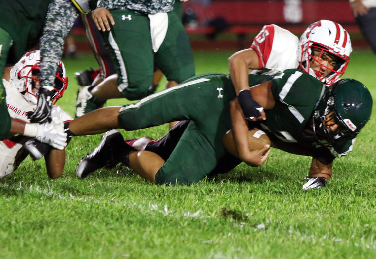 TIM WRIGHT Hawaii Prep's Tayson Hirayama stops Pahoa quarterback Jaydan Broad-Melander last week during Ka Makani's 51-14 victory. The Daggers face Kamehameha on Thursday night, while Ka Makani play Kohala at home at 3 p.m. Saturday,