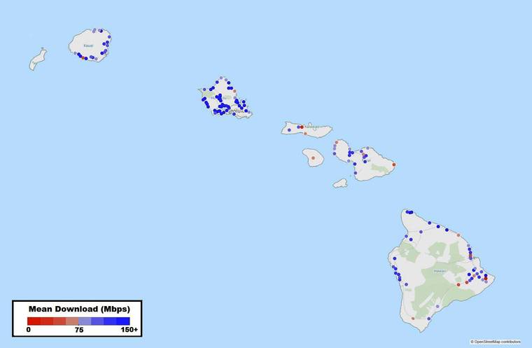 But while the improvements are good news, Hawaii County still lags behind all of the other counties except Kauai. Hawaii County’s 123.70 megabits per second download speed and 22.1 Mbps upload speed pale in comparison to Oahu’s 162.99 Mbps download and 38.39 Mbps upload speeds.