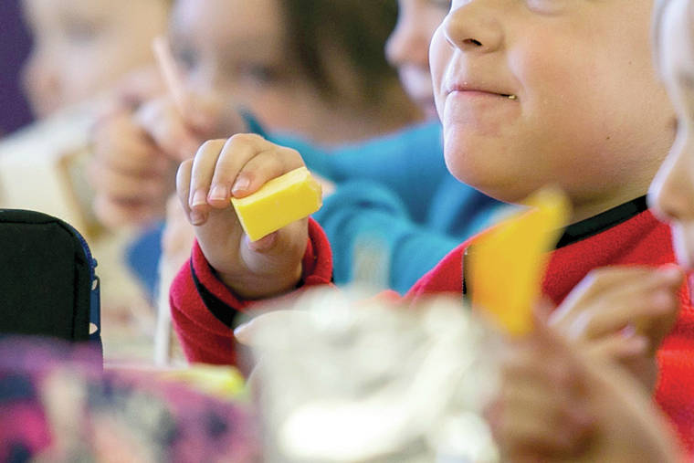 FILE - In this Monday, Oct. 29, 2018 file photo, kids eat lunch at an elementary school in Paducah, Ky. It is far easier to avoid gaining weight than to lose it, so getting kids to eat well and exercise is crucial. But how to do that effectively is extremely difficult _ and sensitive. (Ellen O’Nan/The Paducah Sun via AP)