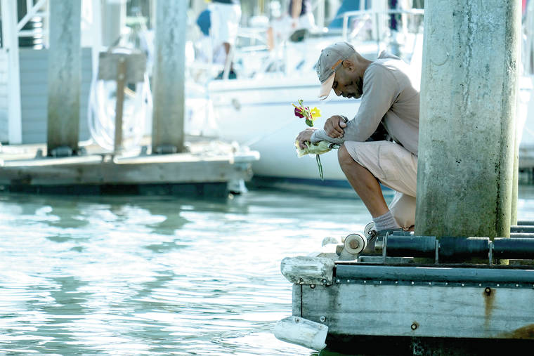 James Miranda of Santa Barbara holds flowers and takes a moment to reflect at a dock near the Sea Landing at Santa Barbara Harbor in Santa Barbara, Calif., Monday, Sept. 2, 2019. A fire raged through a boat carrying recreational scuba divers anchored near an island off the Southern California coast early Monday, leaving multiple people dead and hope diminishing that any of the more than two dozen people still missing would be found alive. (AP Photo/Ringo H.W. Chiu)