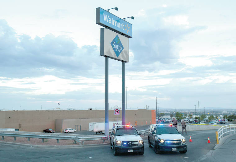 FILE - In this Aug. 3, 2019, photo texas state police cars block the access to the Walmart store in the aftermath of a mass shooting in El Paso, Texas. The Bentonville, Arkansas-based discounter says Tuesday, Sept. 3, that it will be discontinuing the sale of short-barrel and handgun ammunition. (AP Photo/Andres Leighton, File)