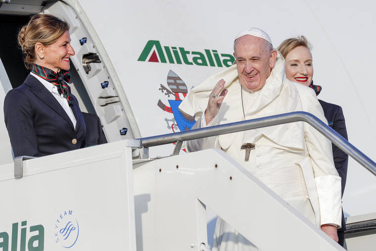 Pope Francis waves as he boards an aircraft on his way to Maputo, Mozambique, in Rome’s Fiumicino International airport, Wednesday, Sept. 4, 2019. Pope Francis heads this week to the southern African nations of Mozambique, Madagascar and Mauritius, visiting some of the world’s poorest countries in a region hard hit by some of his biggest concerns: conflict, corruption and climate change. (AP Photo/Andrew Medichini)
