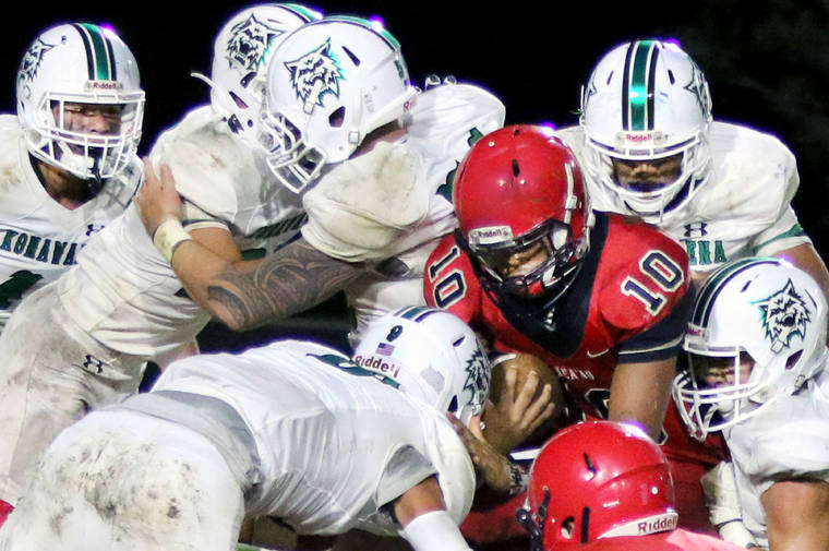 Keaau's Bryant Respicio-Mercado runs into a wall of Konawaena tacklers Friday during the Wildcats 36-0 victory in BIIF Division I.