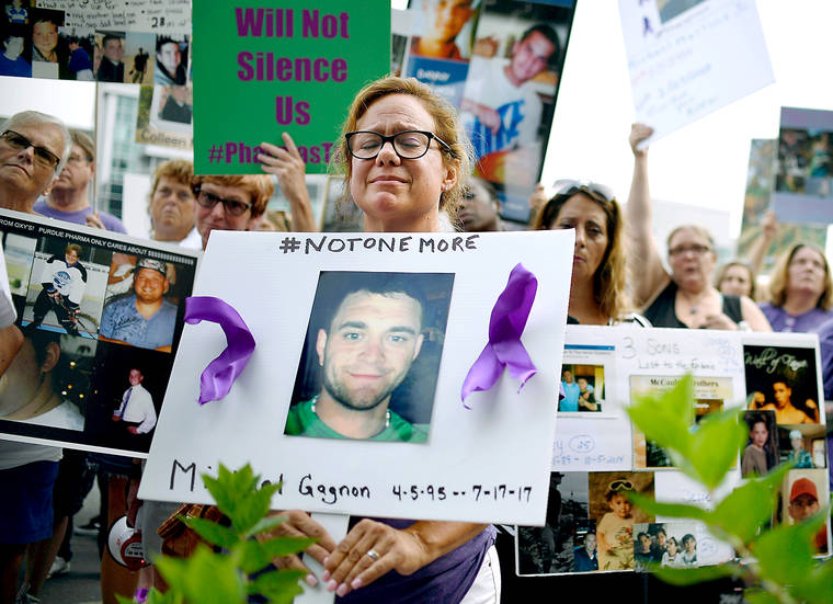 In this 2018 file photo, Christine Gagnon of Southington, Conn., protests with other family and friends who have lost loved ones to OxyContin and opioid overdoses at Purdue Pharma LLP headquarters in Stamford, Conn. (AP Photo/Jessica Hill, File)