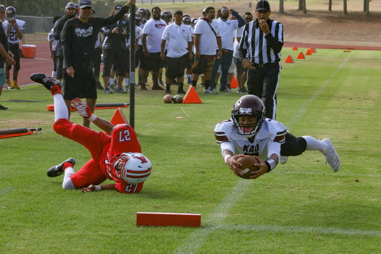 Newly named Ka Makani team captain Umikoa Kealoha came through big for his team in the second half, reeling off 81 rushing yards and setting up a pair of short Hawaii Prep touchdown runs by Zachary Machold and Jakob Honda. Kealoha was 2 of 8 passing the ball for 50 yards with an interception and also ran in a two-point conversion.