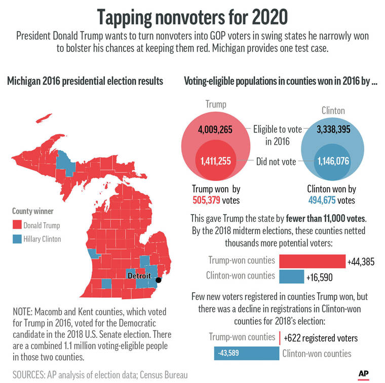 In Michigan, which Trump carried by 11,000 votes, there is opportunity in places such as the GOP stronghold of Ottawa County west of Grand Rapids. As many as 50,000 eligible voters didn’t cast ballots in 2016, according to an Associated Press analysis of voter data, and Trump won the county by a 2-to-1 margin.