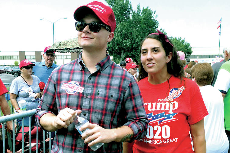 Ashley Arentz, 28, of Jacksonville, N.C., waits in line with friend Jonathan Ritter to enter a rally that President Donald Trump staged for Republican congressional candidate Dan Bishop in Fayetteville, N.C., Monday, Sept. 9, 2019. Arentz, a Marine, said she signed up to vote at the rally. Trump’s campaign is on the hunt for political unicorns: Trump’s team is searching for people in battleground states who support the president but didn’t vote in 2016. (AP Photo/Alan Fram)