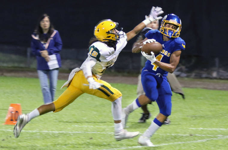 Hilo senior cornerback Elijah Apao got the scoring started in the first quarter when he picked up a fumble and scored on a 32-yard return.