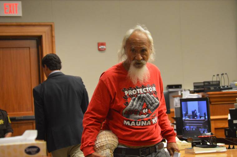 When his name was called for his case, Abel Lui, a Ka‘u elder known as “Uncle Abel,” rose in his second-row gallery seat and blew loudly on a conch shell, or pu.