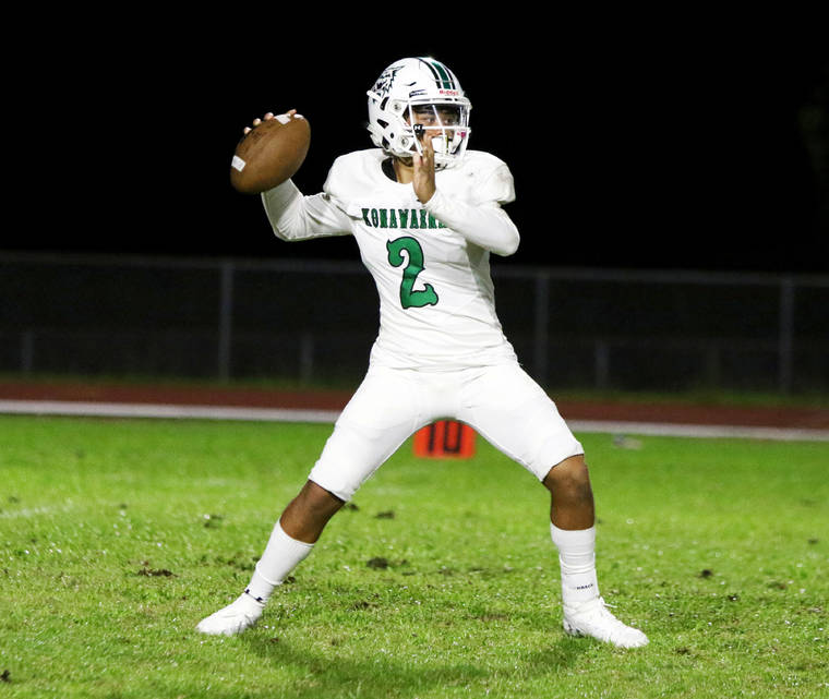 The steady play of quarterback Kainoa “Boo” Jones has helped keep Konawaena on its juggernaut pace. But even that came with a twist. Uemoto said Jones hurt his ankle in a non-league game against Mission Viejo back on Aug. 23, which has forced the junior QB to sit in the pocket more, relying more on his instincts as a passer rather than athletic ability.