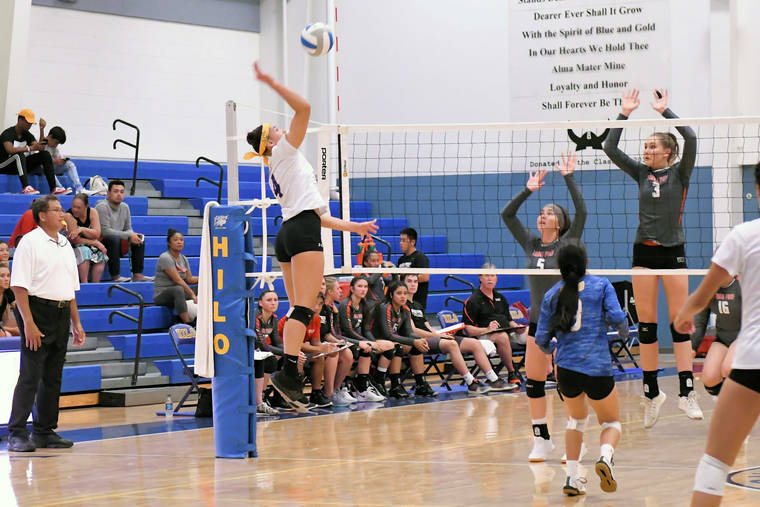 RICK OGATA photo Hilo's Mahala Ka'apuni swats a ball Thursday night during the Vikings' 25-15, 25-19, 25-17 home win against Hawaii Prep.