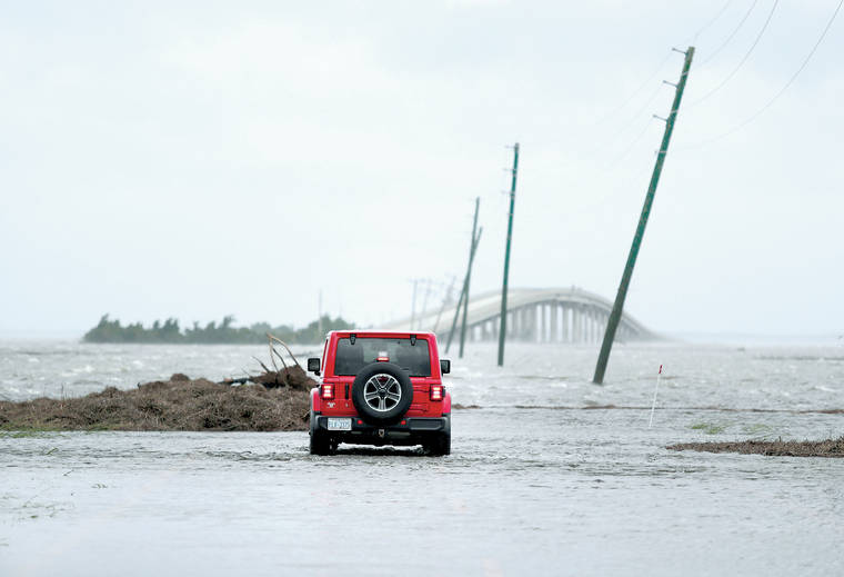 FILE - In this Friday, Sept. 6, 2019 file photo, storm surge from Hurricane Dorian blocks Cedar Island off from the mainland on NC 12 in Atlantic Beach, N.C., after Hurricane Dorian passed the coast. A special United Nations-affiliated oceans and ice report released on Wednesday, Sept. 24, 2019 projects three feet of rising seas by the end of the century, much fewer fish, weakening ocean currents, even less snow and ice, and nastier hurricanes, caused by climate change. (AP Photo/Tom Copeland)