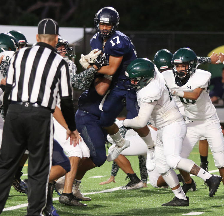 The teams combined for 23 penalties, 14 by Pahoa. After establishing a first-and-10 at Kamehameha’s 24 in the first half, one Daggers’ drive stalled after a humorous if not laborious sequence that included seven plays, four flags and three timeouts.