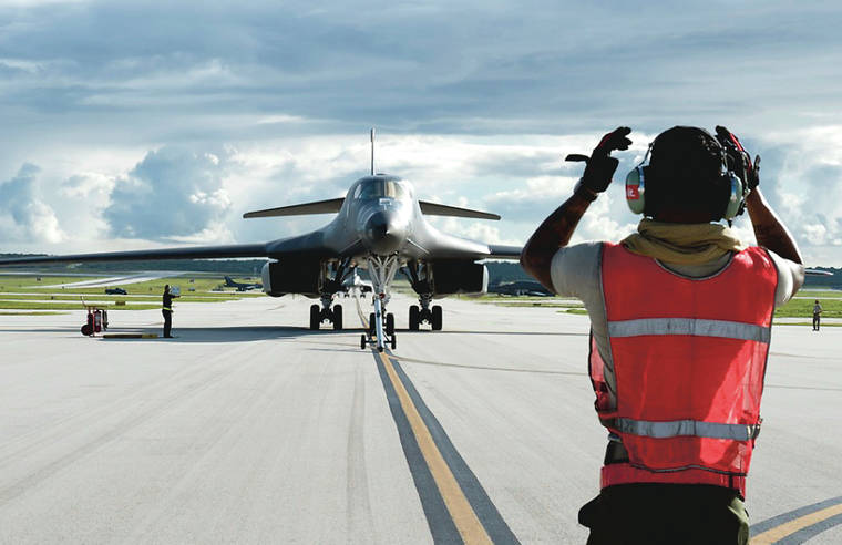 A U.S. Air Force B-1B Lancer arrives in 2017 at Andersen Air Force Base, Guam. (U.S. Air Force by Tech. Sgt. Richard P. Ebensberger via The AP, File)