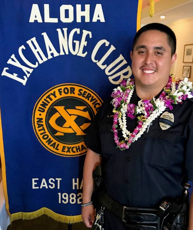 The Aloha Exchange Club of Hilo recognized Officer Andrew Springer, a five-year veteran of the Hawaii Police Department, as “Officer of the Month” for August.