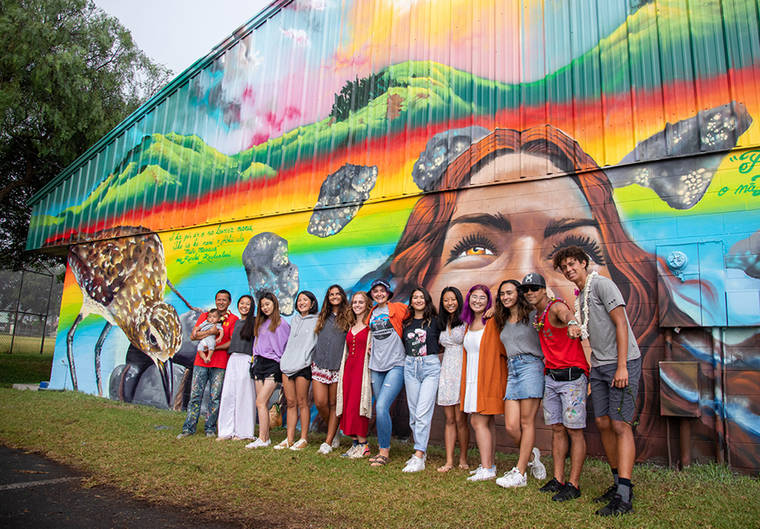 Courtesy photo Hawaii Preparatory Academy high school students pose Saturday in front of a mural they created with the help of Mele Murals, the flagship program of The Estria Foundation.