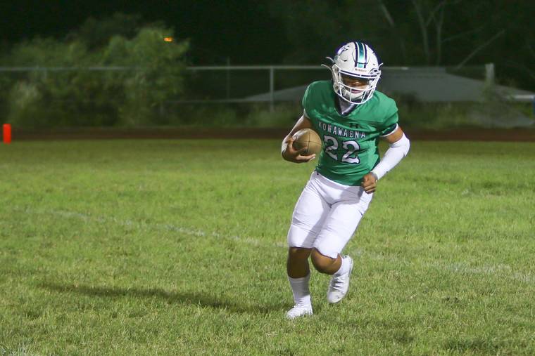 Thane Milhoan/Big Island Sports Network Konawaena freshman standout Hezekiah Anahu-Ambrosio had a pair of first quarter touchdowns last week that helped set the tone against rival Kealakehe last week.