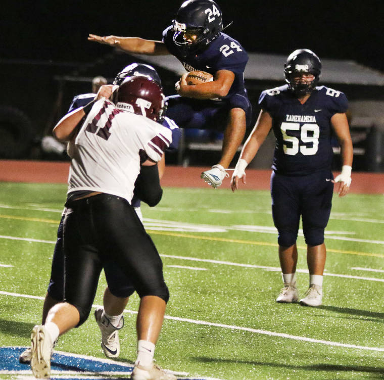 TIM WRIGHT/Tribune-Herald Kamehameha's Apu Alfiche leaps into the end zone on a short run Thursday night during the Warriors' 49-8 victory against Ka'u.